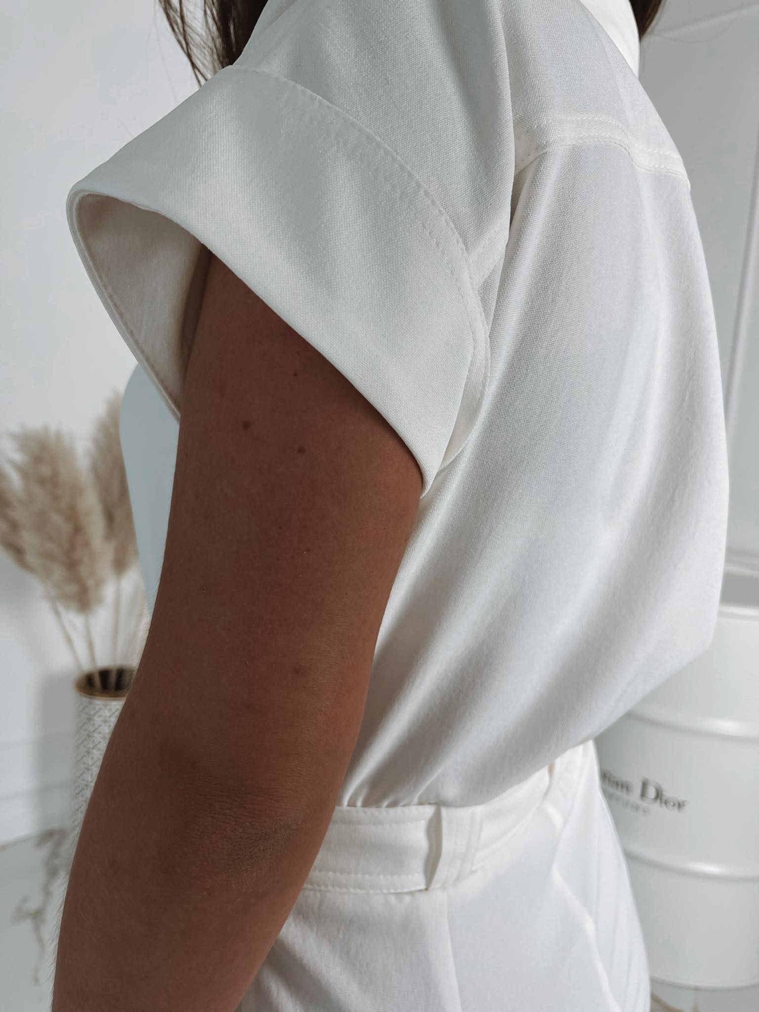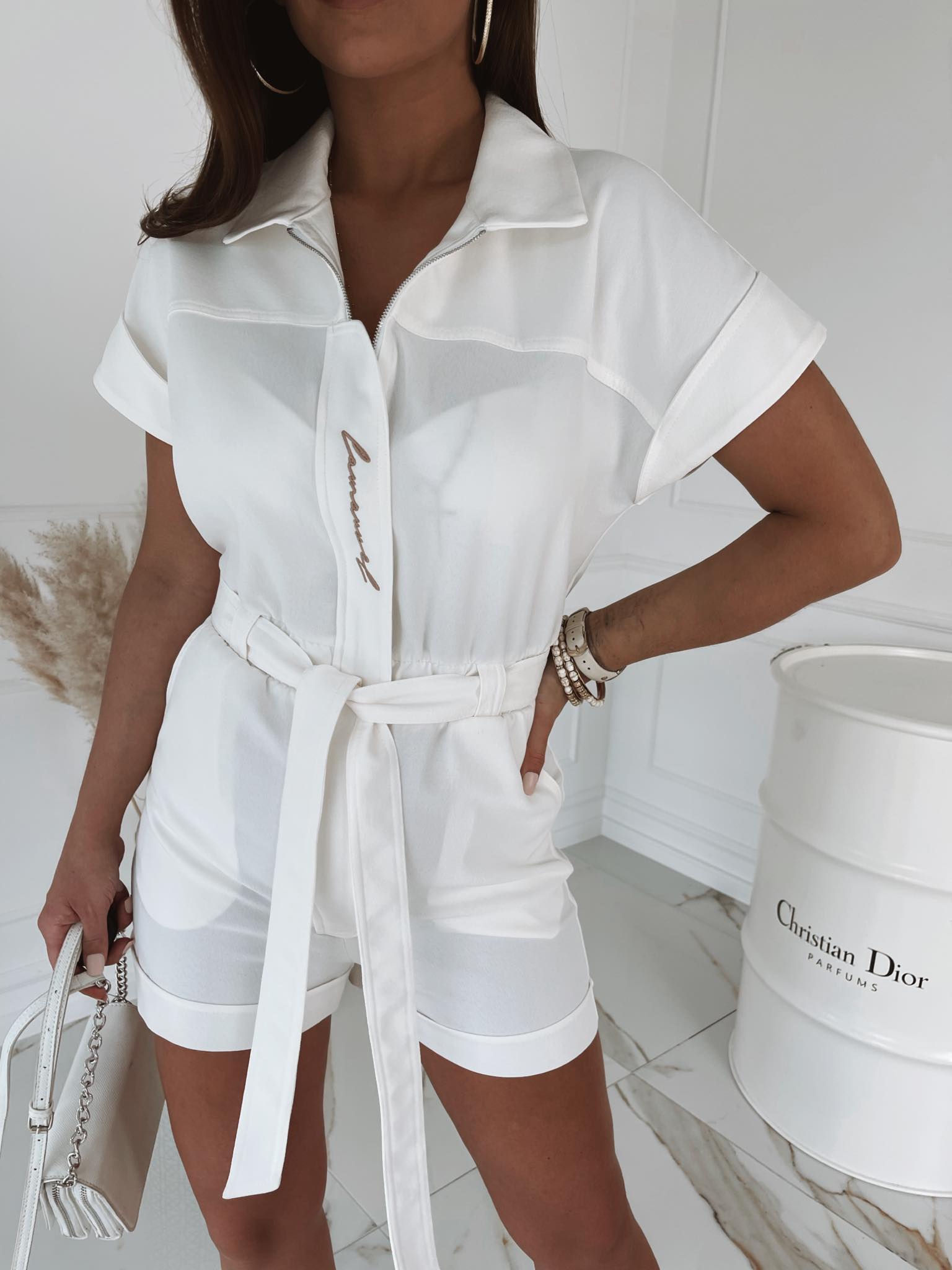 Kombinezon krótki La Manuel biały. Kombinezon zapinany jest na suwak który ukryty jest pod klapą zdobioną wyhaftowanym logiem firmy. Model ten posiada dołączony materiałowy pasek. Kombinezon idealnie sprawdzi się w letnim sezonie.